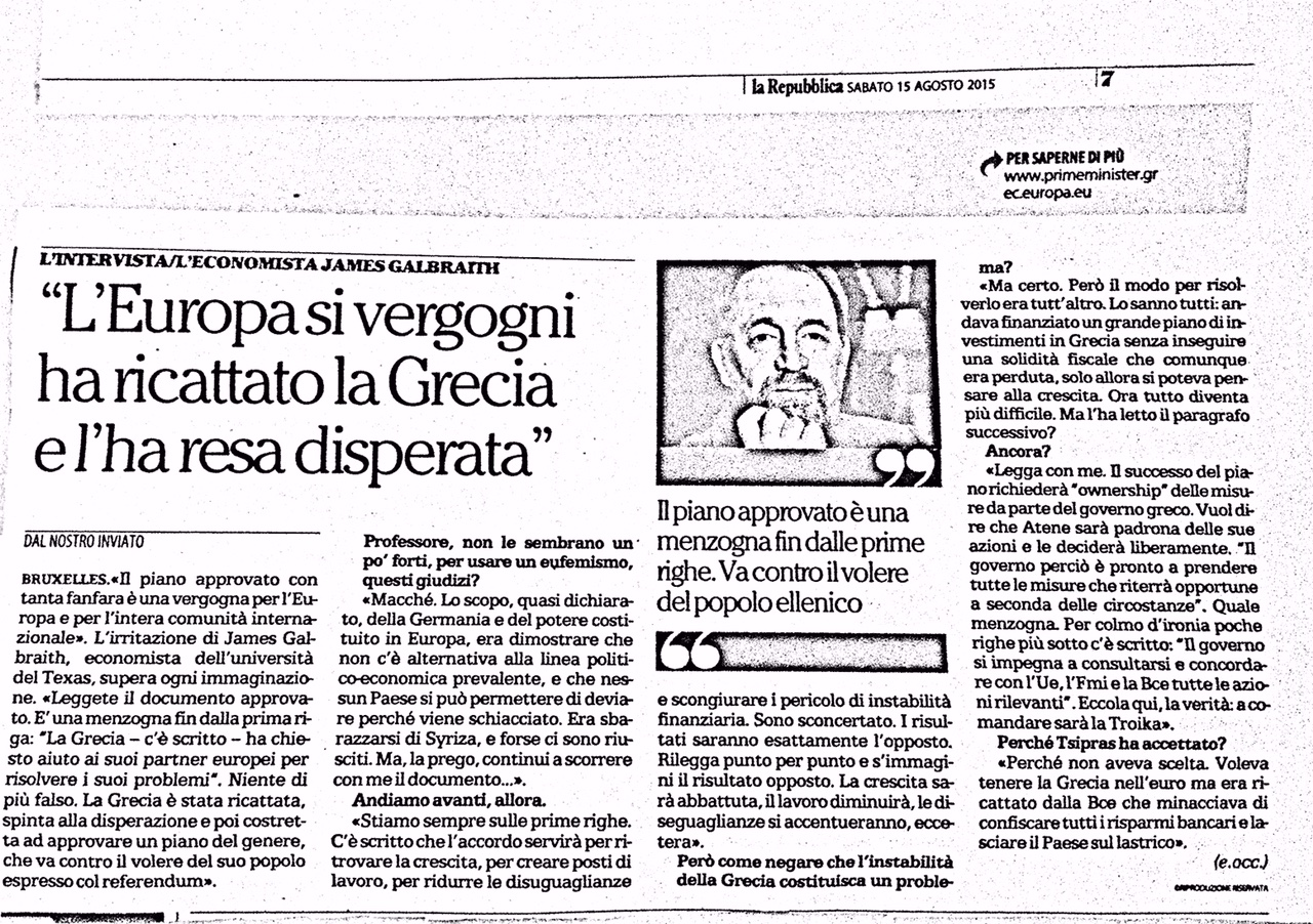 Pubblichiamo una intervista che il Prof. Galbraith, economista americano di fama mondiale e consulente, nonché collega, dell’ex ministro greco Varoufakis, ha rilasciato al quotidiano “Repubblica” il giorno 15 agosto.