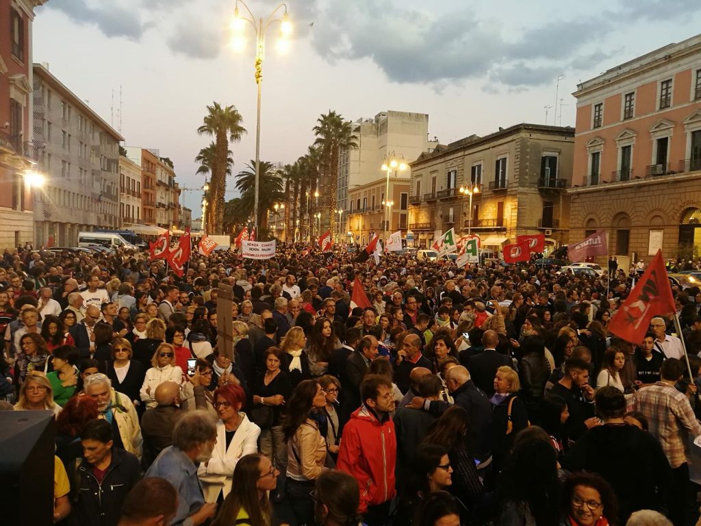 La manifestazione si è tenuta a Piazza Prefettura ed ha avuto una partecipazione molto numerosa. L’intera piazza è stata gremita a testimonianza dello spirito democratico e antifascista del popolo pugliese.